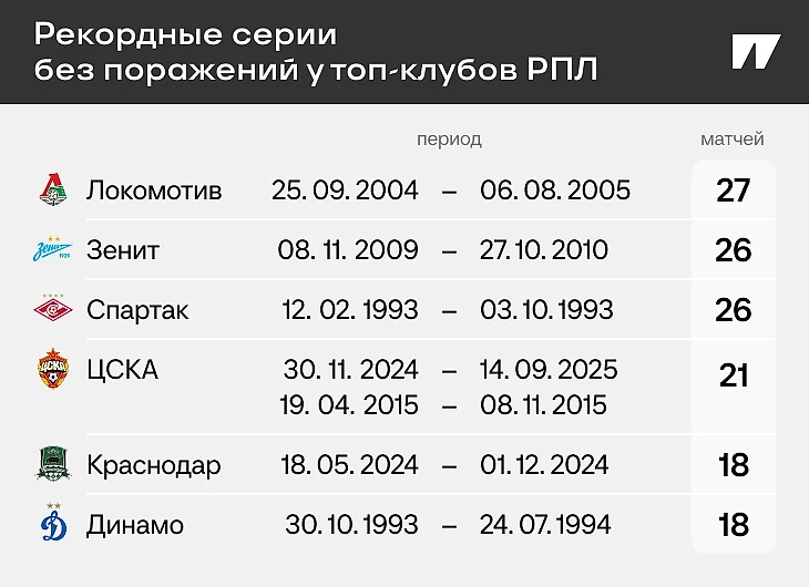 Москвичи стартовали с четырех побед, но далее в пяти матчах подряд делили очки. Были близки к ничьей и в противостоянии с «Рубином» (1:0) – у казанцев отменили гол в концовке встречи. Любопытно, что «Локомотив» подобрался к историческому рекорду «Динамо»: в 1998-м бело-голубые делили очки с соперниками семь раз подряд.