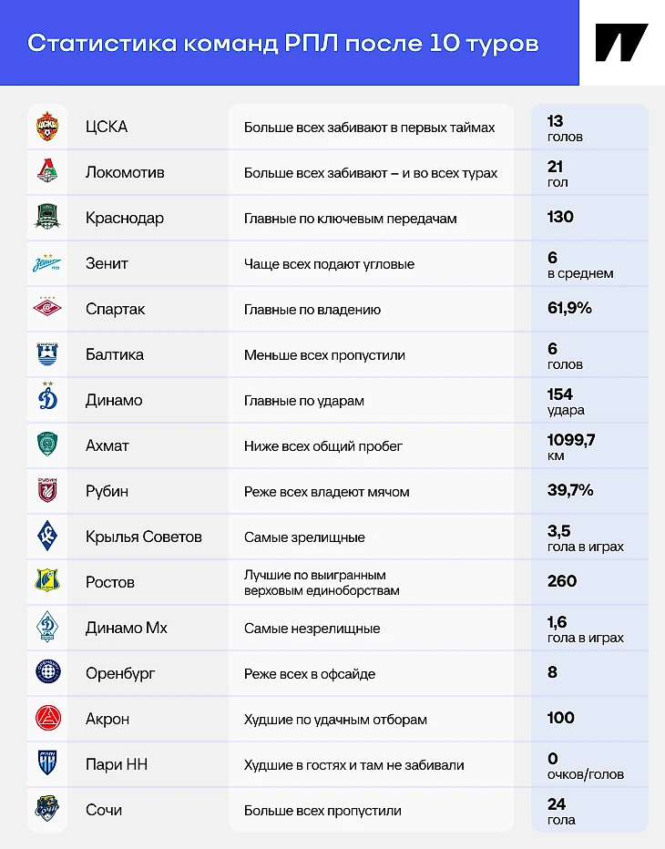 В РПЛ позади треть сезона, все клубы по итогам десяти туров отметились интересными цифрами.