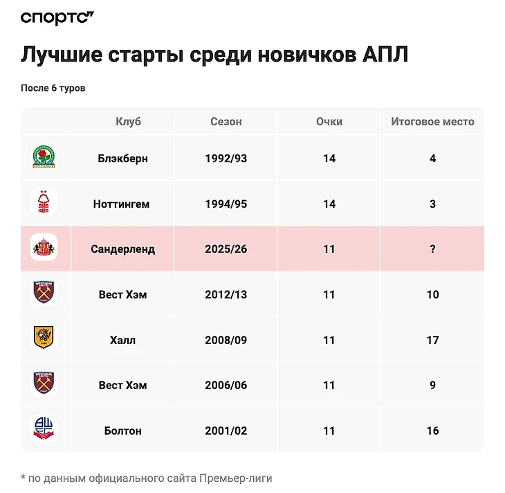 Но «Сандерленд» внезапно выдал лучший старт среди новичков АПЛ за 13 лет. По данным сайта Премьер-лиги, лучше стартовали только «Блэкберн» в 1992-м и «Ноттингем» в 1994-м. К слову, все новички с 11+ очками в стартовых шести турах сохраняли место в элите.