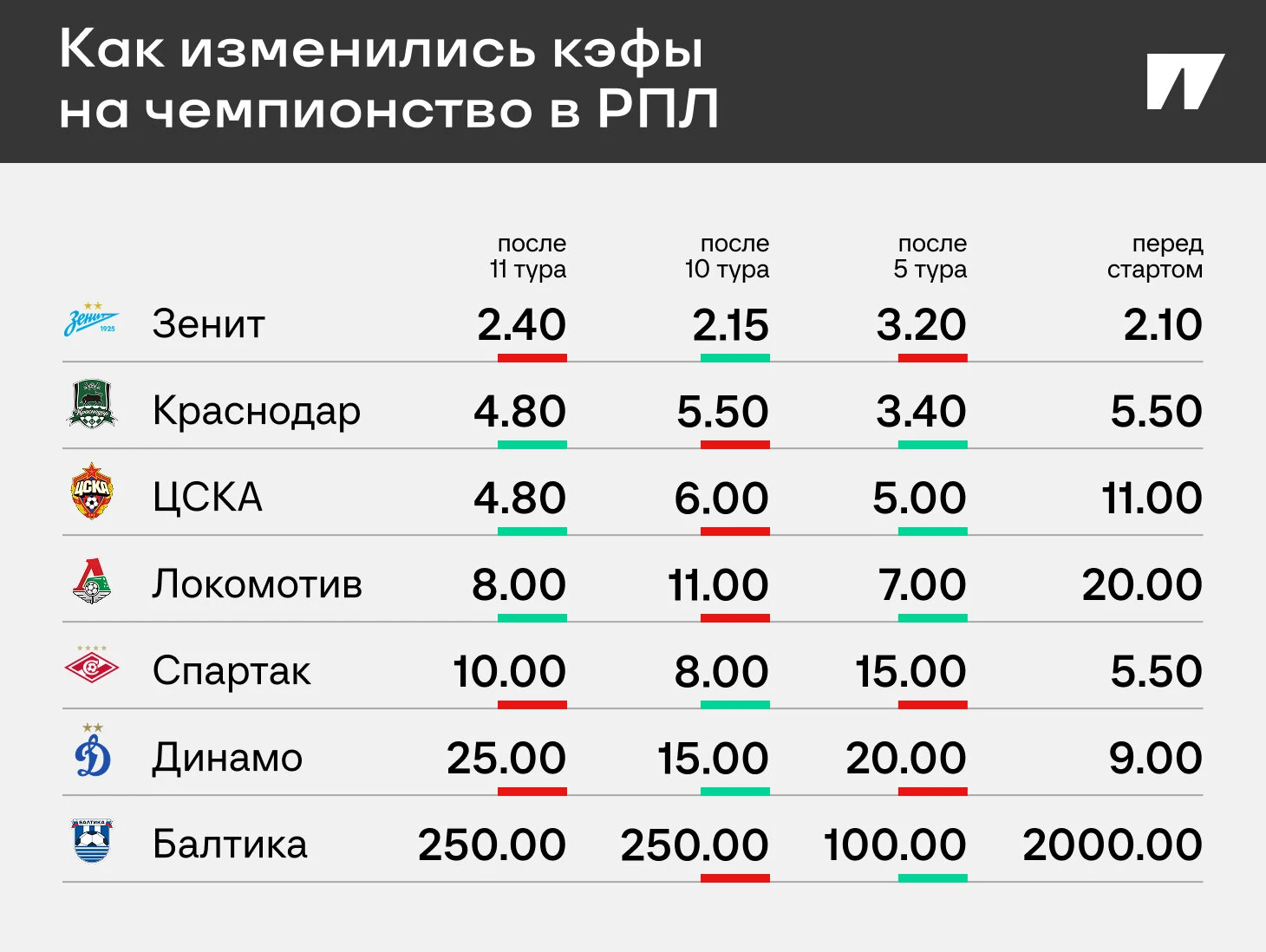 ЦСКА шел с изначальным 2.55, но получал несколько туров 1.60 (и 1.55 сейчас). У «Локо» на старте было 5.00, а после пятого матча – уже 2.00, что чуть увеличилось к этому моменту до 2.20. «Динамо» давали 2.30, но с тех пор коэффициент рос вдвое, а теперь – почти втрое (6.50). Заодно подключались «Рубин» (17.00) и «Балтика» (15.00).