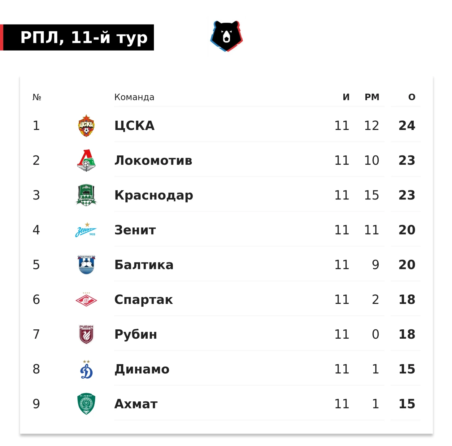 Для начала – таблица. Напомним, после десятого тура в тройке находились ЦСКА, «Локомотив» и «Краснодар», вне ее – «Зенит», «Спартак» и «Динамо», а в топ-5 максимальная разница составляла три очка.
