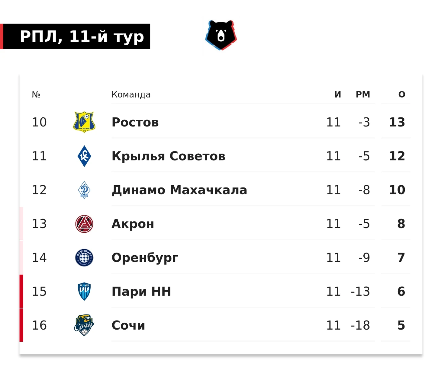 Два изначальных аутсайдера остались внизу, третьего сменил «Сочи»