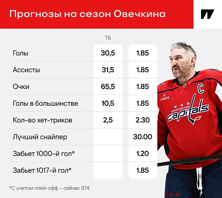 Овечкин в прошлом сезоне остановился на отметке в 897 голов в регулярке. То есть скоро будет первым, кто доберется до уникального юбилея. Букмекеры принимают ставки, когда же это случится.