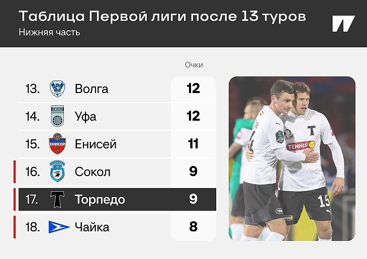 Но борются они не за выход в РПЛ, а за выживание. Вот что происходит после 13 туров. Еще четыре матча – и уже закончится первый круг, а «Торпедо» почти на дне.