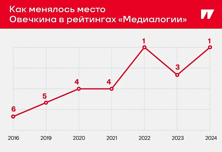 С 2016 года (первый рейтинг «Медиалогии») только два спортсмена ни разу не выпадали из топ-10: Александр Овечкин и Артем Дзюба. За 9 лет (и 7 рейтингов) Артем ни разу не выпал из топ-3, а Овечкин с каждым годом постепенно поднимается: в 2016-м он был на шестом месте по цитируемости после Акинфеева, Исинбаевой, Шараповой, Дзюбы и Кокорина, с 2019-го – в топ-5, а в 2022-м и 2024 году – самый популярный российский спортсмен в СМИ.