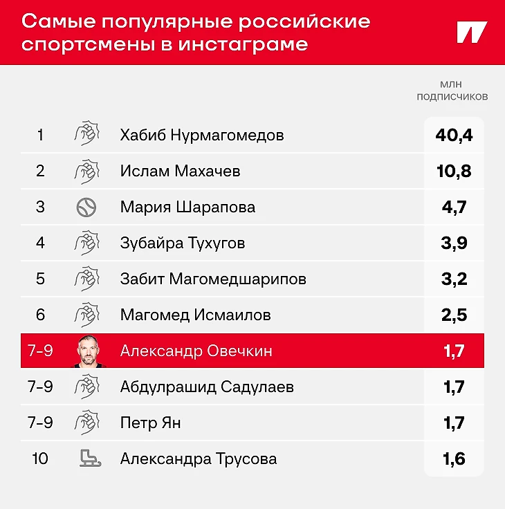 Причина, скорее всего, в не очень большой глобальной аудитории хоккея в соцсетях. По количеству подписчиков Овечкин на одном уровне с бойцами из команды Хабиба, которые даже не всегда разрывали в UFC, но в топе среди хоккеистов.