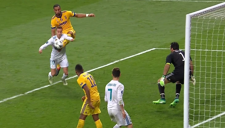 Роналду скинул мяч Лукасу Васкесу на линию вратарской, он готовился бить мимо Буффона с очень близкого расстояния.