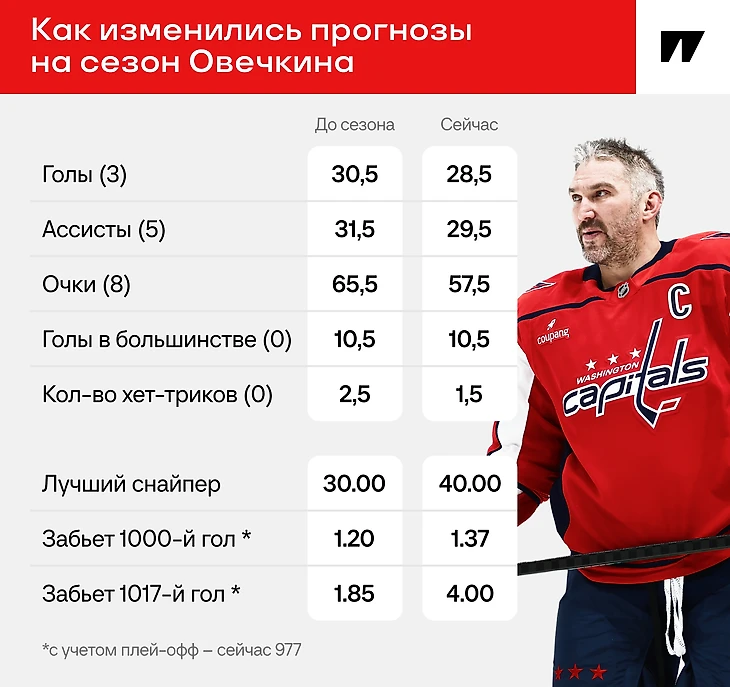 Вместо 30 голов теперь ждут 28, а вместо 65 очков – 57. При этом аналитики все еще верят в 1000-ю шайбу Ови с учетом плей-офф. Да, кэф поднялся с 1.20 до 1.37, но если к текущему количеству голов (977) добавить прогнозируемые 28 в регулярке, получится аж 1005.