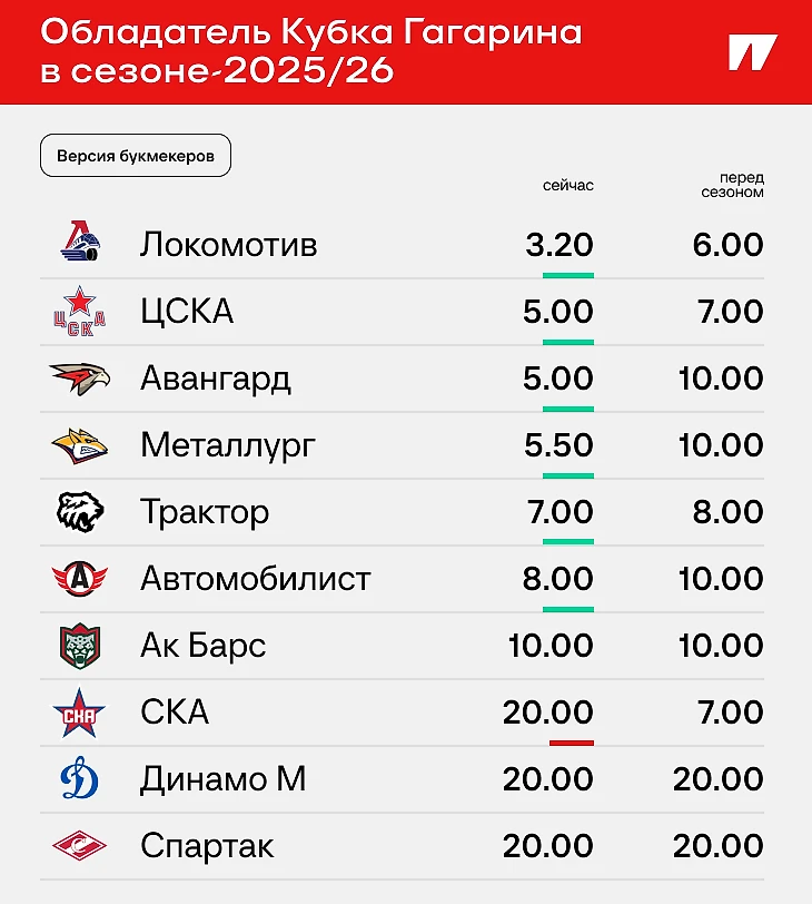 Шансы СКА и «Спартака» уже сравнялись, ЦСКА – все равно в топе фаворитов. Что в раскладах КХЛ