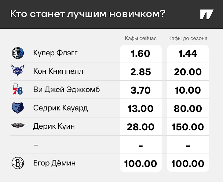 Неспокойно и без стабильности – у новичков. Здесь как раз ожидалось доминирование Купера Флэгга, но пока букмекеры вынуждены аккуратно поднимать коэффициенты на Купера и следить за относительно неожиданными конкурентами.