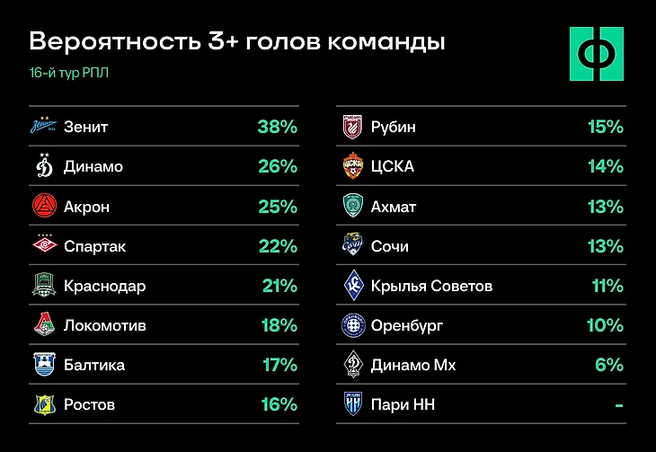 ● Вторым фаворитом на разгром стоит московское «Динамо». Здесь важный нюанс: махачкалинцы идут на рекорд по матчам на тотал меньше: была только одна верховая игра в первом круге – получили 0:4 от «Зенита». При этом в Москве против одноклубников у них случился прокол в прошлом сезоне: сгорели 0:4 в марте 2025-го.