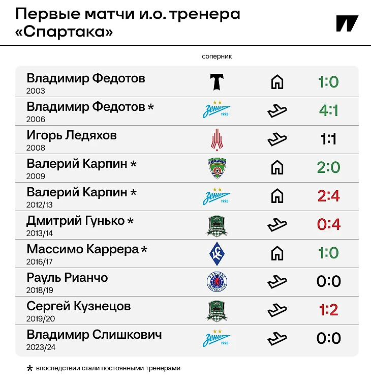 Романов – девятый и.о. главного в «Спартаке» за XXI век. Владимир Федотов и Валерий Карпин побывали в этой роли не один раз. Они, а также Дмитрий Гунько и Массимо Каррера позже перешли в статус постоянного тренера.