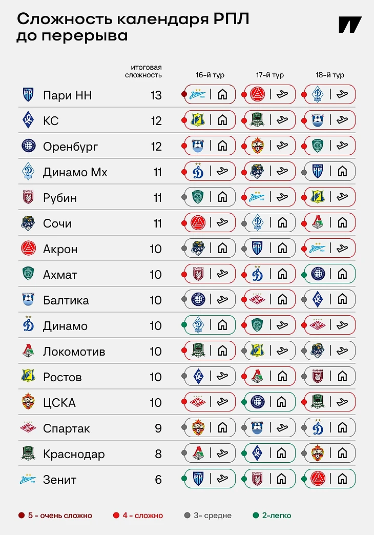В Мир РПЛ – последний рывок перед каникулами, три последних тура в 2025-м. В ноябре-декабре часто важно не только качество футбола: легионеры замерзают, поля становятся хуже, усталость накапливается. Легкий календарь на этом отрезке – приятный бонус.