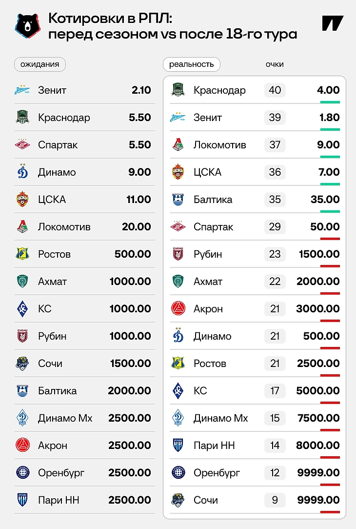 Зимняя пауза в Мир РПЛ – отличный повод проверить, сбылись ли предсезонные прогнозы. Букмекерские котировки – один из ориентиров в оценке раскладов.