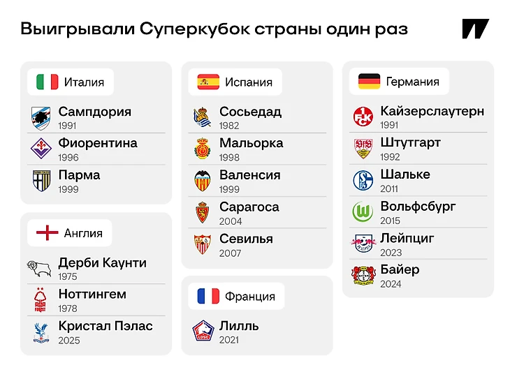Не исключено, что в ближайшее время список клубов, выигрывавших этот трофей лишь однажды, пополнится. В топ-5 лигах таких немало.