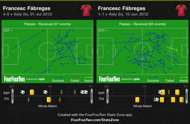 Сразу под Фабрегосом выступал Хави, который провел блестящий матч. В матче десятого июня между Испанией и Италией, Хави играл мало роли, действовал очень глубоко и он, в отличие от Алонсо и Бускетса, не так активно прессинговал Пирло.