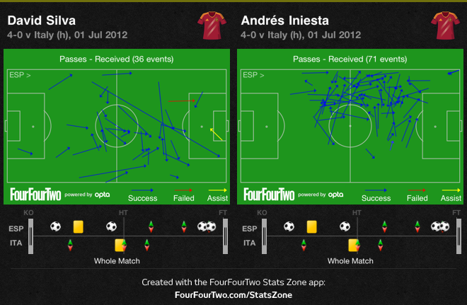 Эту задачу отвели Хави, ему помогали Иньеста и Сильва. Как это получалось? Это было тактическим ходом Дель Боске. Иньеста началм матч справа, а Сильва слева, но это не столько важно, важно то, что оттягиваясь назад, Хави, Сильва и Иньеста окружали Пирло, не давай тому выйти на оперативный простор. В результате чего, Пирло провел свой худший матч на турнире. Об этом говорит и статистика: 8 из 10 обостряющих передач были неточными, поэтому ничего не получалось впереди. Пирло просто напросто закрыли. И не обижайтесь на меня поклоники Андреа, но это был действительно его худший матч.