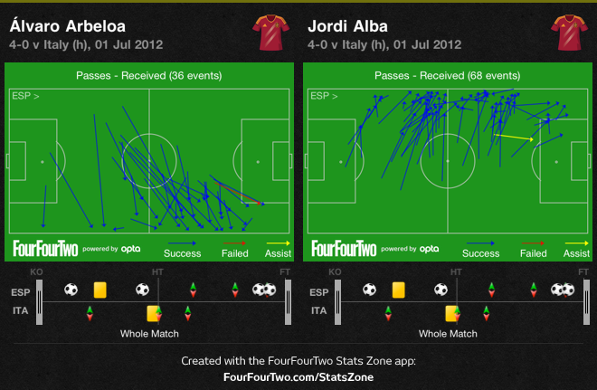 Альба, на своем левом фланге, был менее свободным, т.к Маркизио действовал достаточно широко и часто шла борьба 1-1. Альба был наиболее важным игроком для Испании. Прошу не путать важный и лучший. Хорди играл своеобразную роль, которая и принесла успех Испании. Он обеспечивал широту атакам.