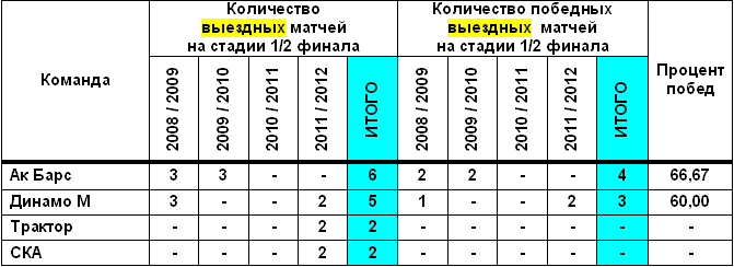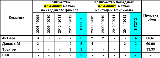 Предлагаю вашему вниманию 3 таблицы, в которых приведена статистика всех 4-х команд, вышедших в 1/2 финала текущего сезона, на этой стадии матчей на вылет за всю историю с момента создания КХЛ.