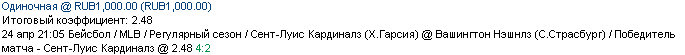 24/04 21:05 Сент-Луис Кардиналз (Х.Гарсия) @ Вашингтон Нэшнлз (С.Страсбург) / Победитель матча - Сент-Луис Кардиналз @ 2.48 4:2 +++