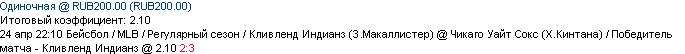24/04 22:10 Кливленд Индианз (З.Макаллистер) @ Чикаго Уайт Сокс (Х.Кинтана) / Победитель матча - Кливленд Индианз @ 2.10 2:3 ---