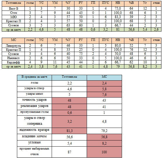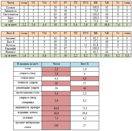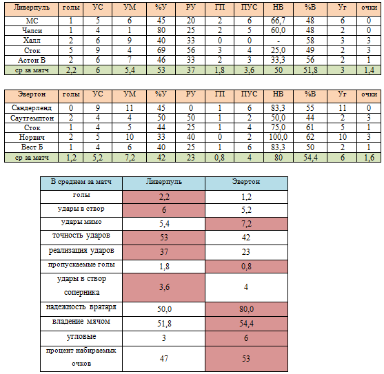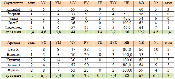 УС – удары в створ, УМ - удары мимо, %У – точность ударов, РУ – реализация ударов (голы/УС), ГП - пропущенные мячи, ПУС – удары в створ соперника, НВ – надежность вратаря (100-(ГП*100/ПУС)), %В – владение мячом, Уг - угловые.