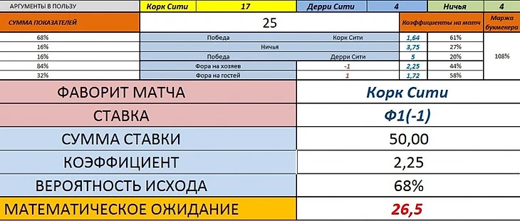 2. 21:45 Ирландия Премьер Лига. Корк Сити - Дерри Сити. Ставка: Ф1(-1) за 2,25. Размер ставки: 50$.