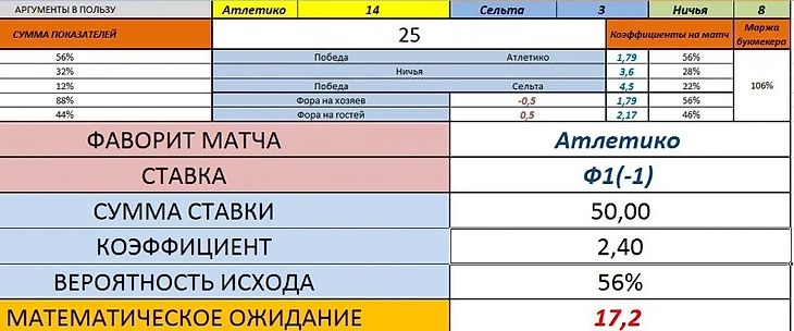 2. 20:30 Испания Ла Лига. Атлетико мадрид - Сельта. Ставка: Ф1(-1) за 2,4. Размер ставки: 50$.