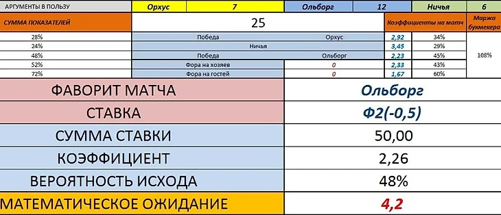 1. 20:00 Дания Суперлига. Орхус - Ольборг. Ставка: Ф2(-0,5) за 2,26. Размер ставки: 50$.