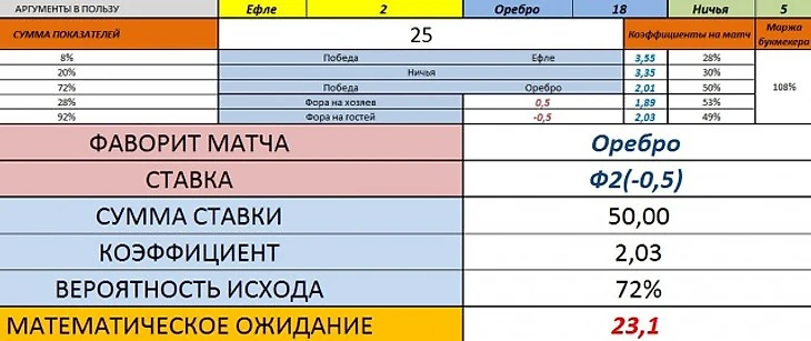 2. 20:00 Швеция Аллсвенскан. Эфле - Эребру. Ставка: Ф2(-0,5) за 2,03. Размер ставки: 50$.