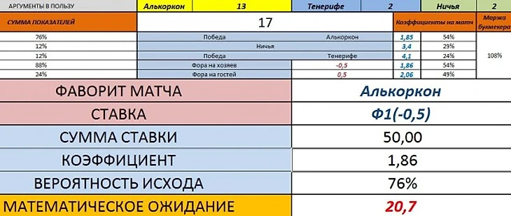 2. 21:30 Испания Сегунда. Алькоркон - Тенерифе. Ставка: Ф1(-0,5) за 1,86. Размер ставки: 50$.