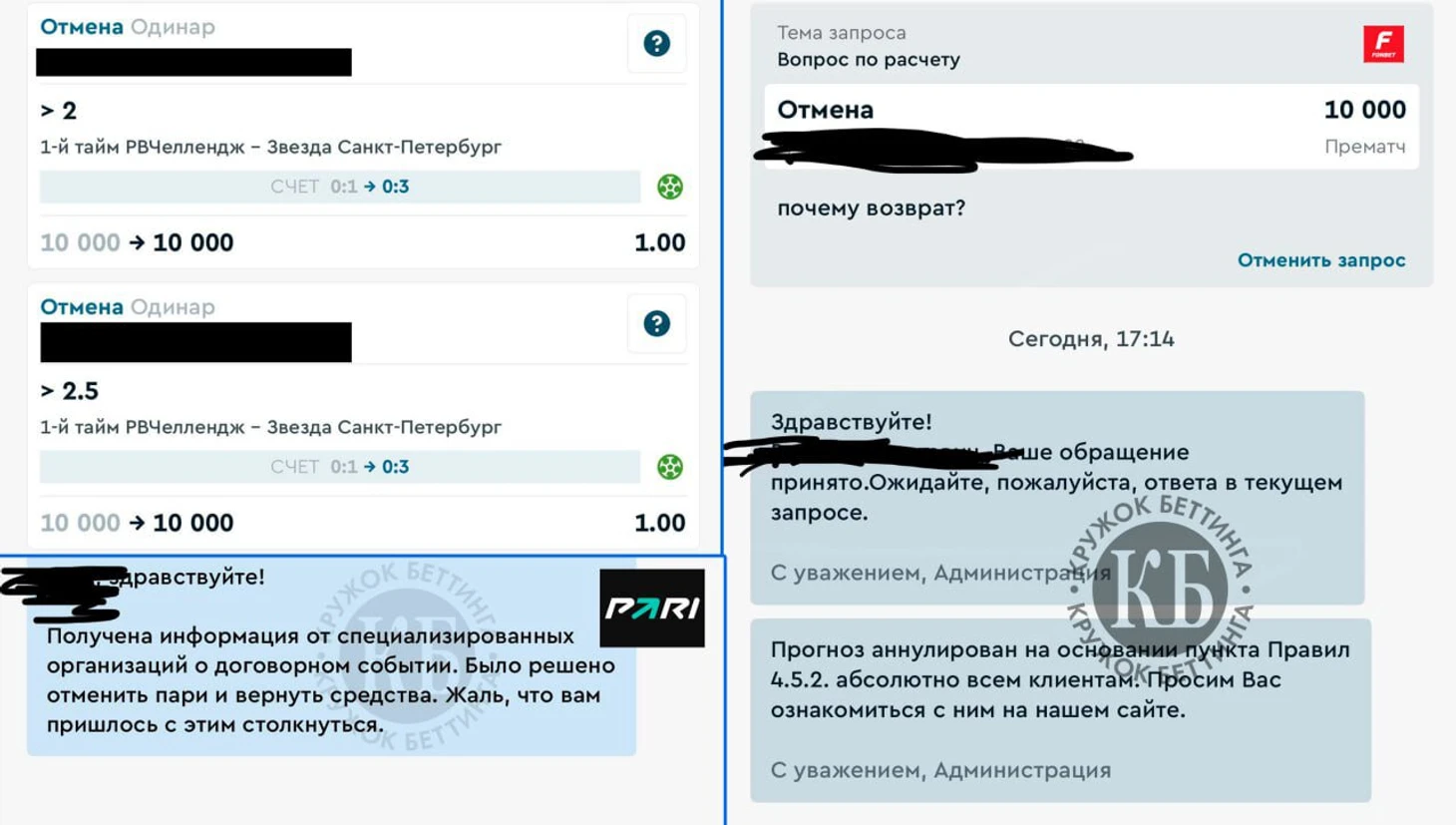 «Получена информация от специализированных организаций о договорном событии. Было решено отменить пари и вернуть средства», – сообщили в поддержке PARI.