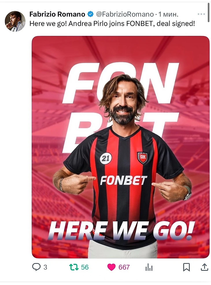 Новость о сотрудничестве экс-полузащитника сборной Италии с букмекером появилась на официальной странице Фабрицио Романо в соцсети X. К посту была прикреплена фотография Пирло в джерси с логотипом «Фонбет».