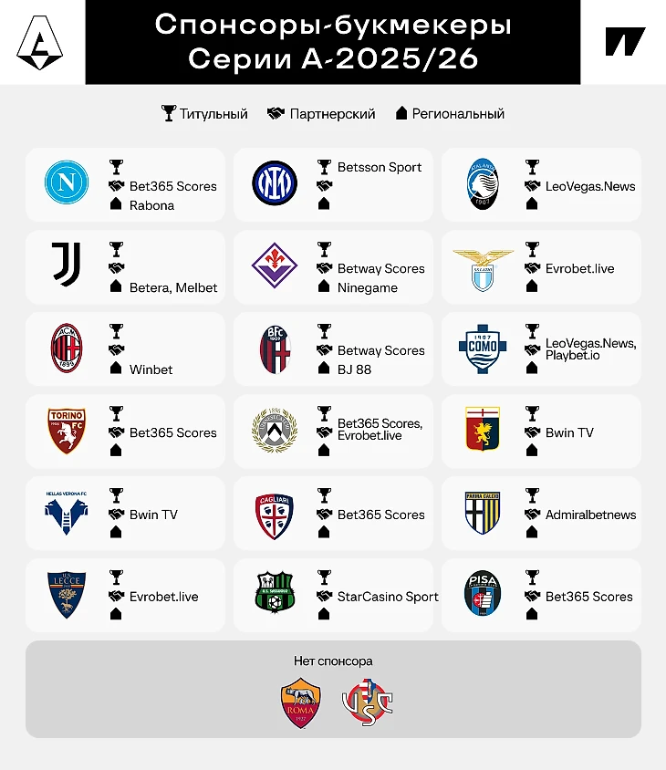 В Серии А ситуация запутанная. Официально запрет очень похож на испанский вариант, существует еще с 2019-го. При этом у нескольких клубов на форме привычные названия известных букмекерских компаний, а в социальных сетях намеки на «особенные сайты для эмоций». Как же так получилось?