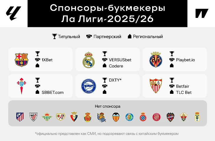 Топ-клубы сохраняют некоторые региональные соглашения. «Барселона» продолжает глобальное сотрудничество с известным брендом 1XBet. Каталонцы подписали редкий по длительности контракт до 2029-го. Букмекер активно использует образы игроков каталонского клуба, но за пределами Испании.