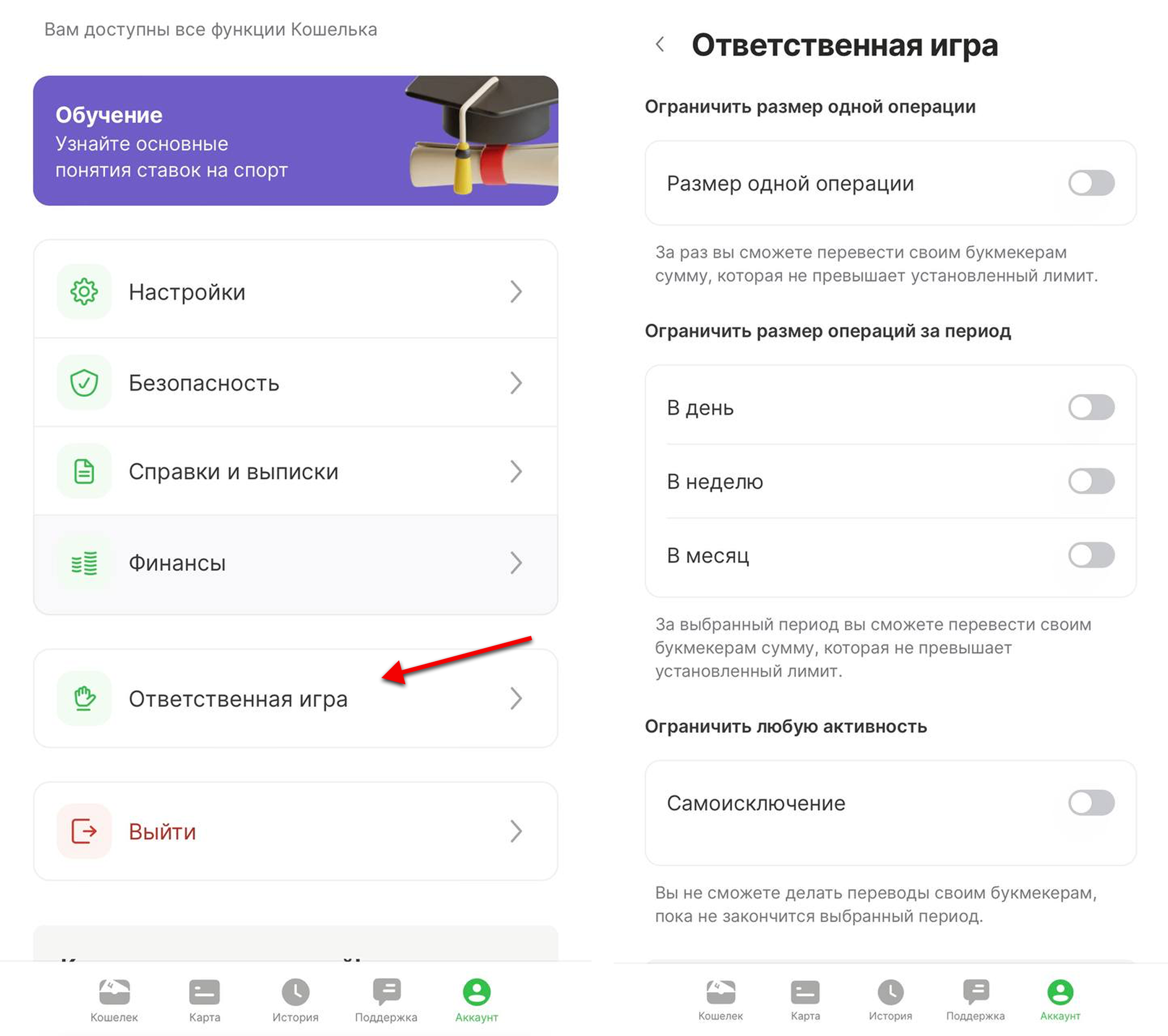 В приложении Единого ЦУПИС доступен раздел «Ответственная игра», который позволяет каждому игроку устанавливать необходимые ограничения. Например, на лимиты по пополнению счетов в БК. Или же просто ограничить себе какие-либо операции. При этом доступ к личному кабинету будет сохранен.
