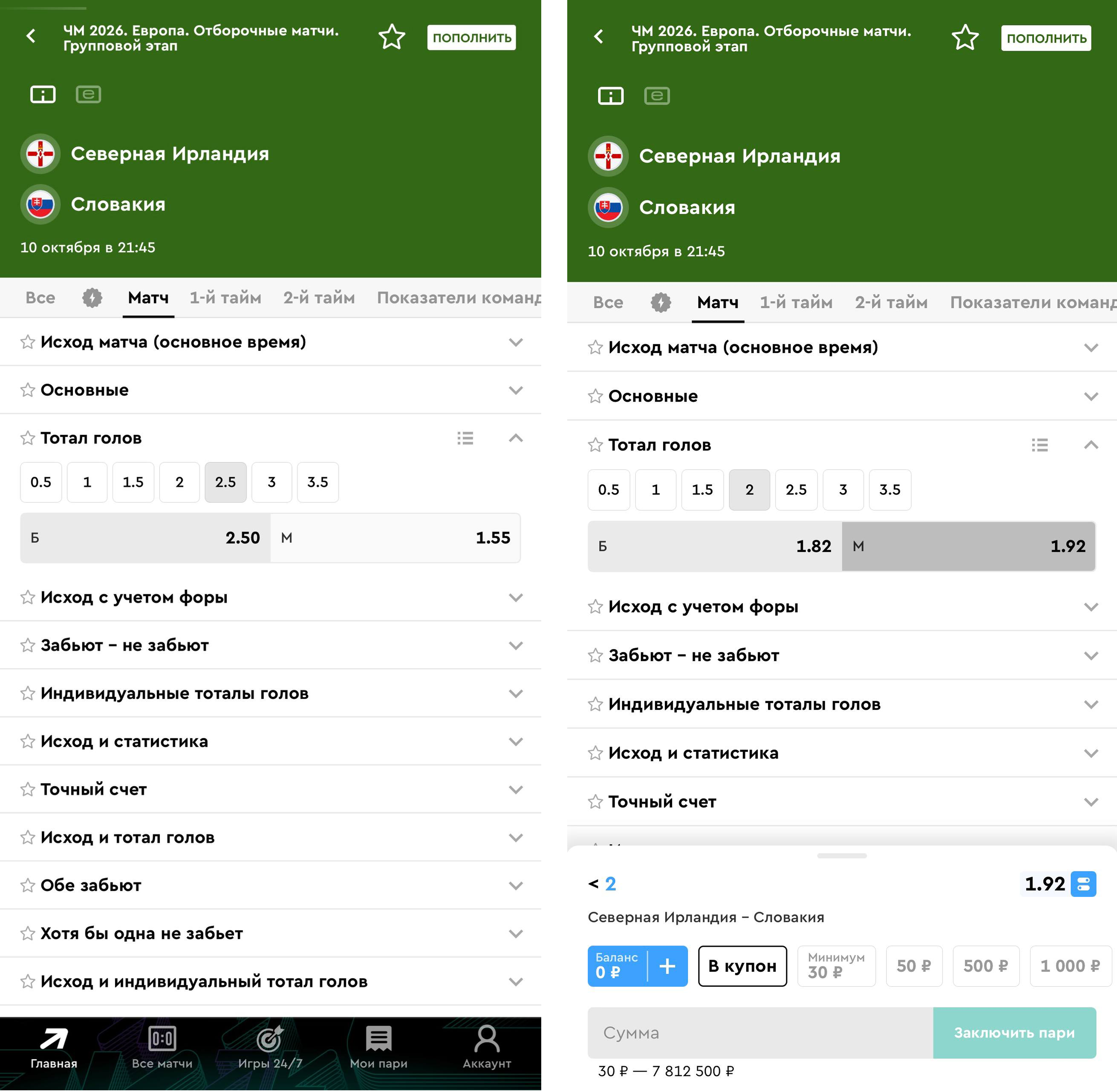 Зачастую ставка тотал меньше 2 используется клиентами БК, чтобы повысить коэффициент. Допустим, вы выбрали матч Северная Ирландия – Словакия, и вам кажется, что в нем не будет много голов. Но коэффициент на тотал меньше 2,5 слишком не слишком велик (1.55) – в таком случае отлично подойдет ТМ 2 с котировкой 1.92.