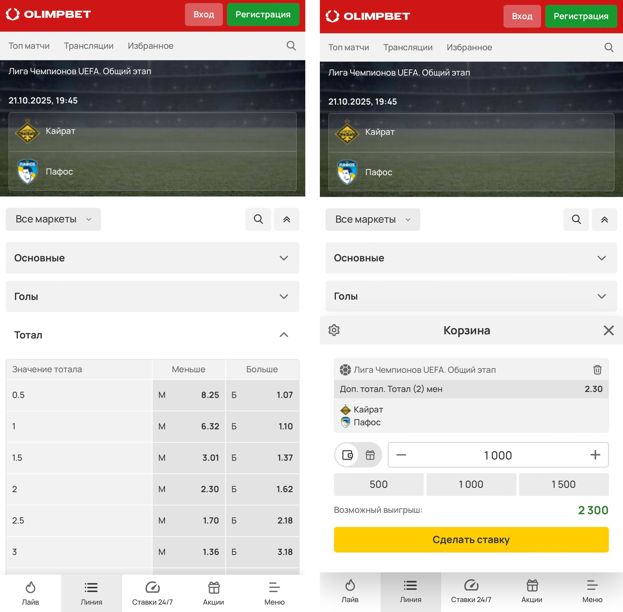 Матч «Кайрат» – «Пафос» в Лиге чемпионов. Ставка на ТМ 2 оценивается коэффициентом 2.30. Вы решились поставить 1000 рублей. Возможные варианты: