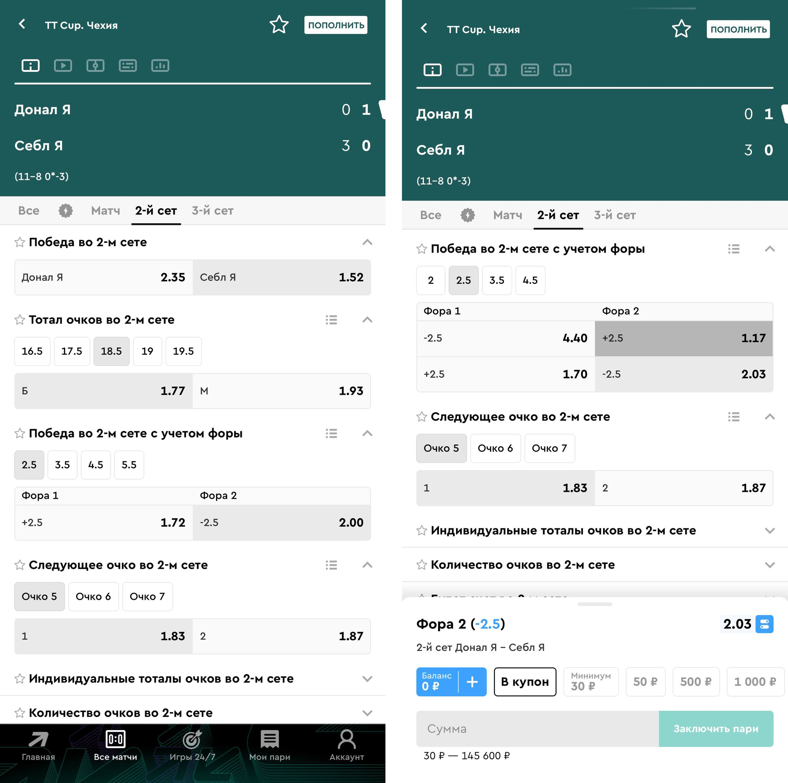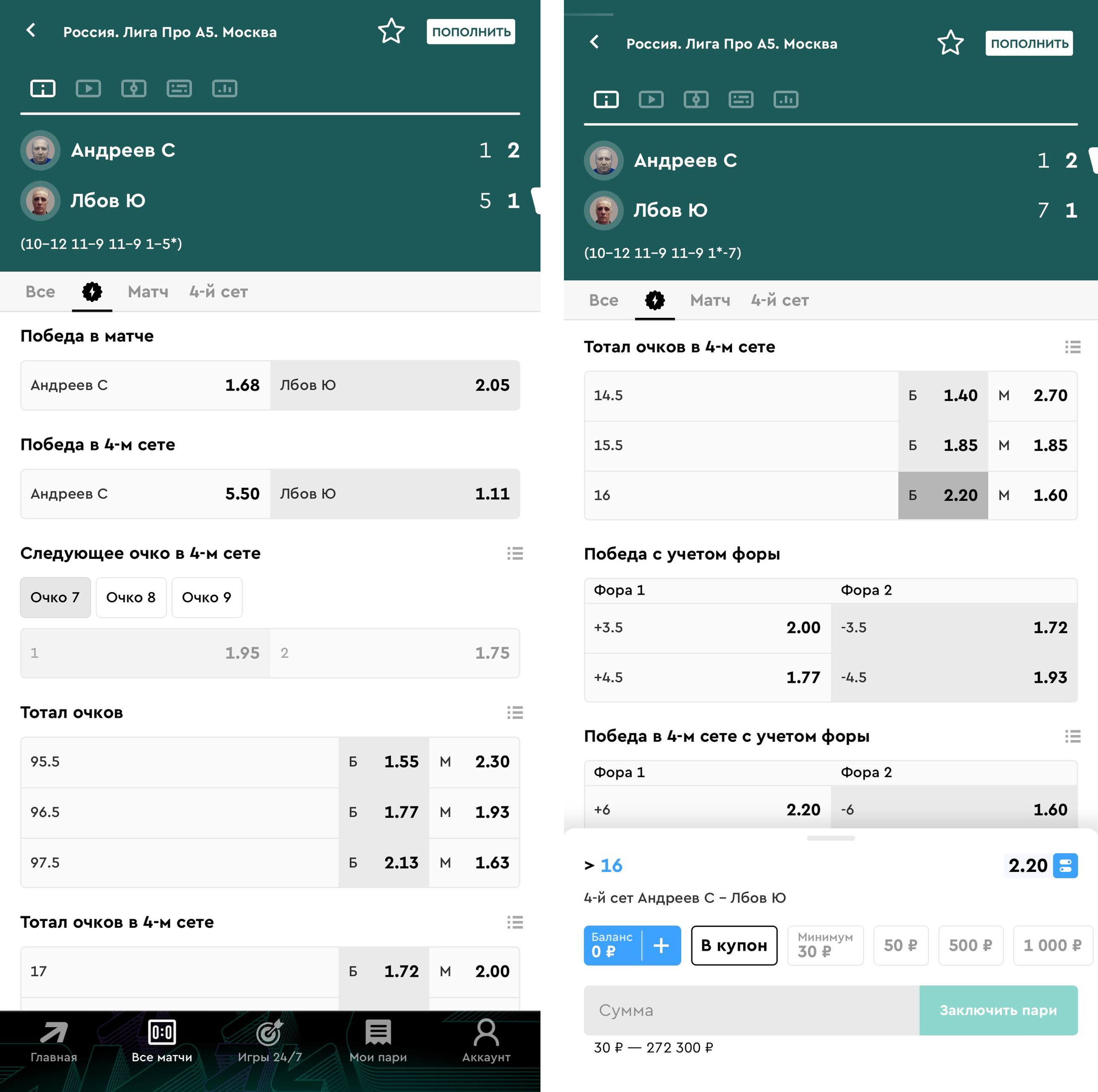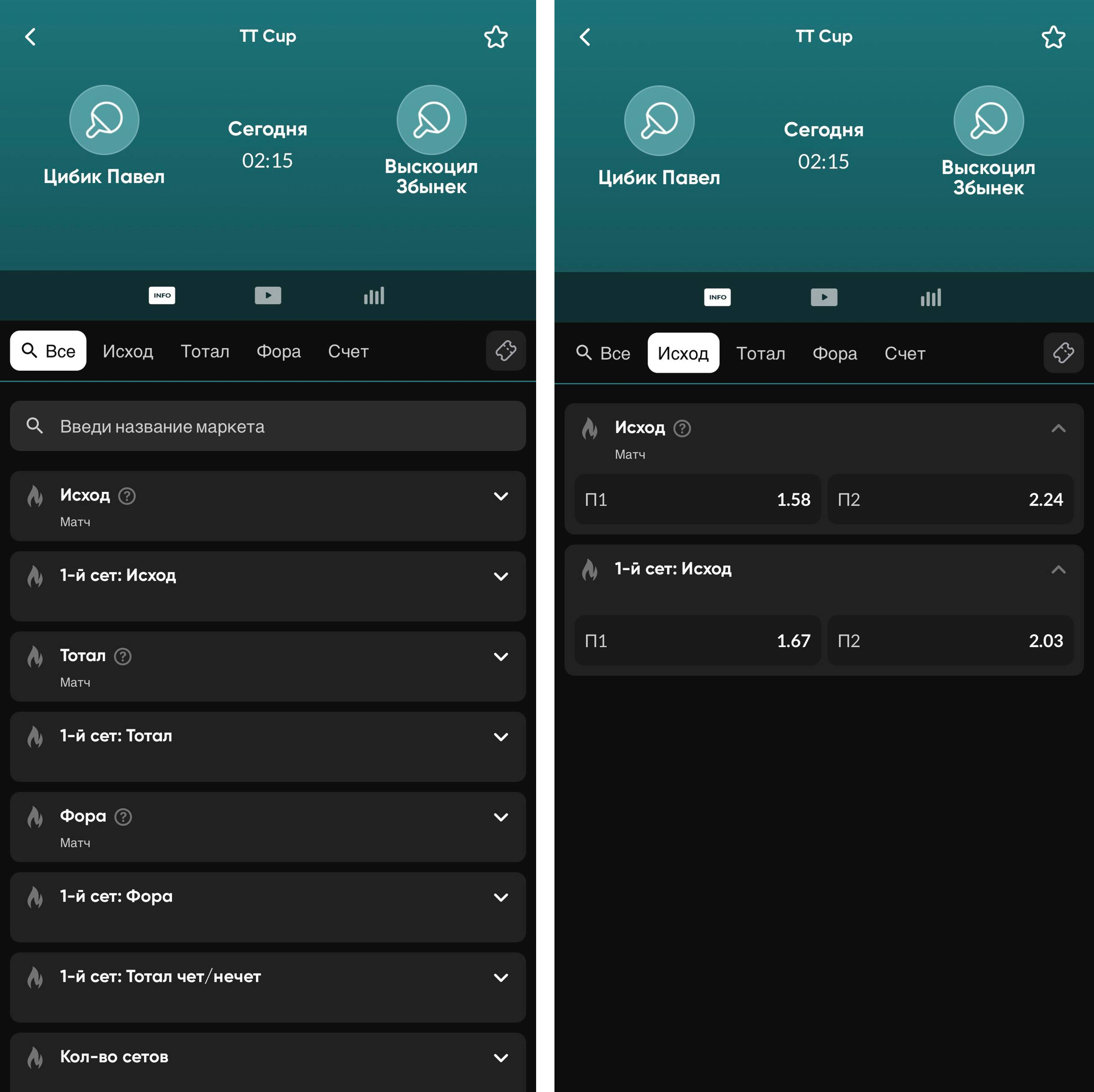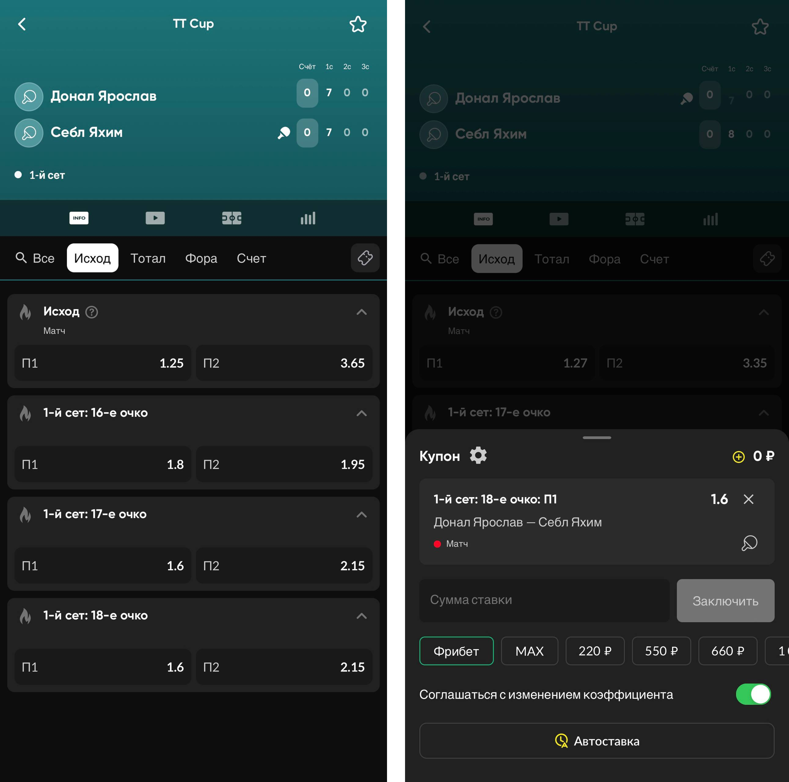 Коэффициенты на настольный теннис в live меняются очень быстро. Будьте готовы реагировать и принимать решение молниеносно.