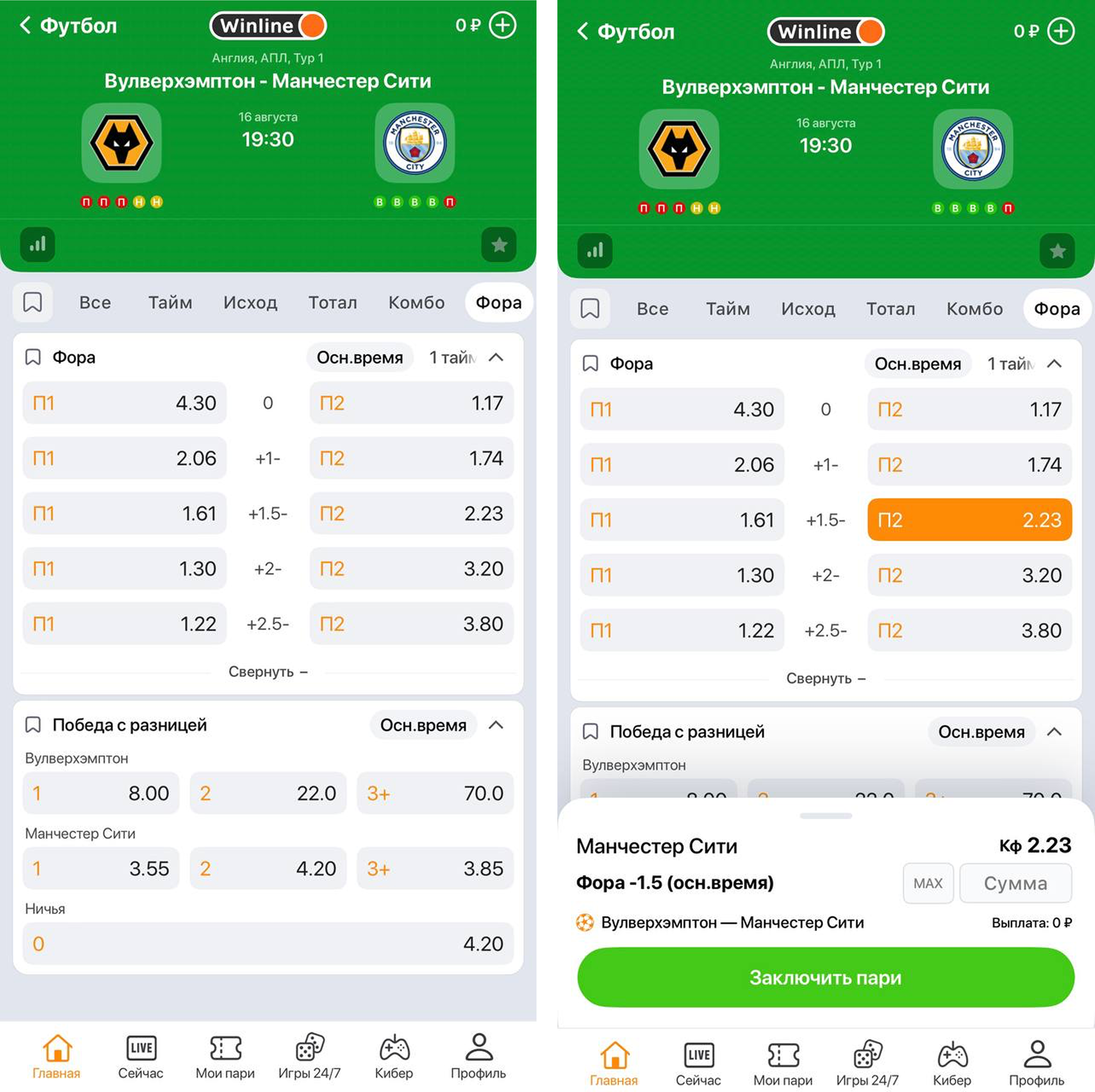 В качестве примера возьмем матч между «Вулверхэмптоном» и «Манчестер Сити». Букмекеры считают номинальных гостей довольно явными фаворитами, предлагая на их победу коэффициент в районе 1.50. Мы также поверим в силу команды Пепа Гвардиолы, но поставим не на чистую победу, а с европейским гандикапом 1:0 П2 за коэффициентом 2.20. Аналог такого рынка – европейская фора (-1.5) на «Ман Сити».