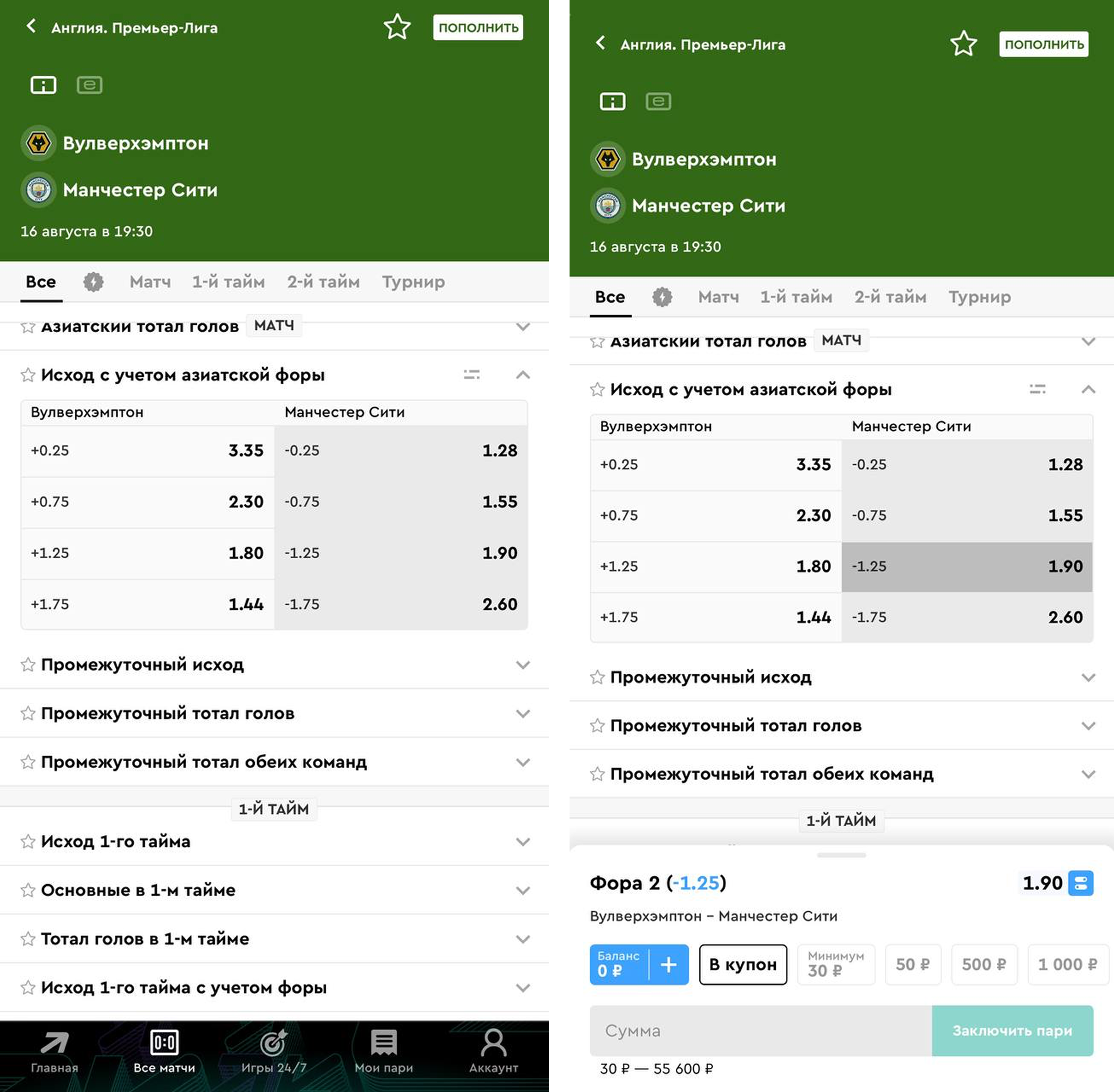 Для большей наглядности рассмотрим азиатский гандикап на примере все того же матча «Вулверхэмптон» – «Манчестер Сити». Наша ставка – 1000 рублей на азиатский гандикап (фору) гостей (-1,25) за коэффициент 1.90. Из них 500 рублей мы ставим на фору (-1,0) и еще 500 рублей на фору (-1,5).