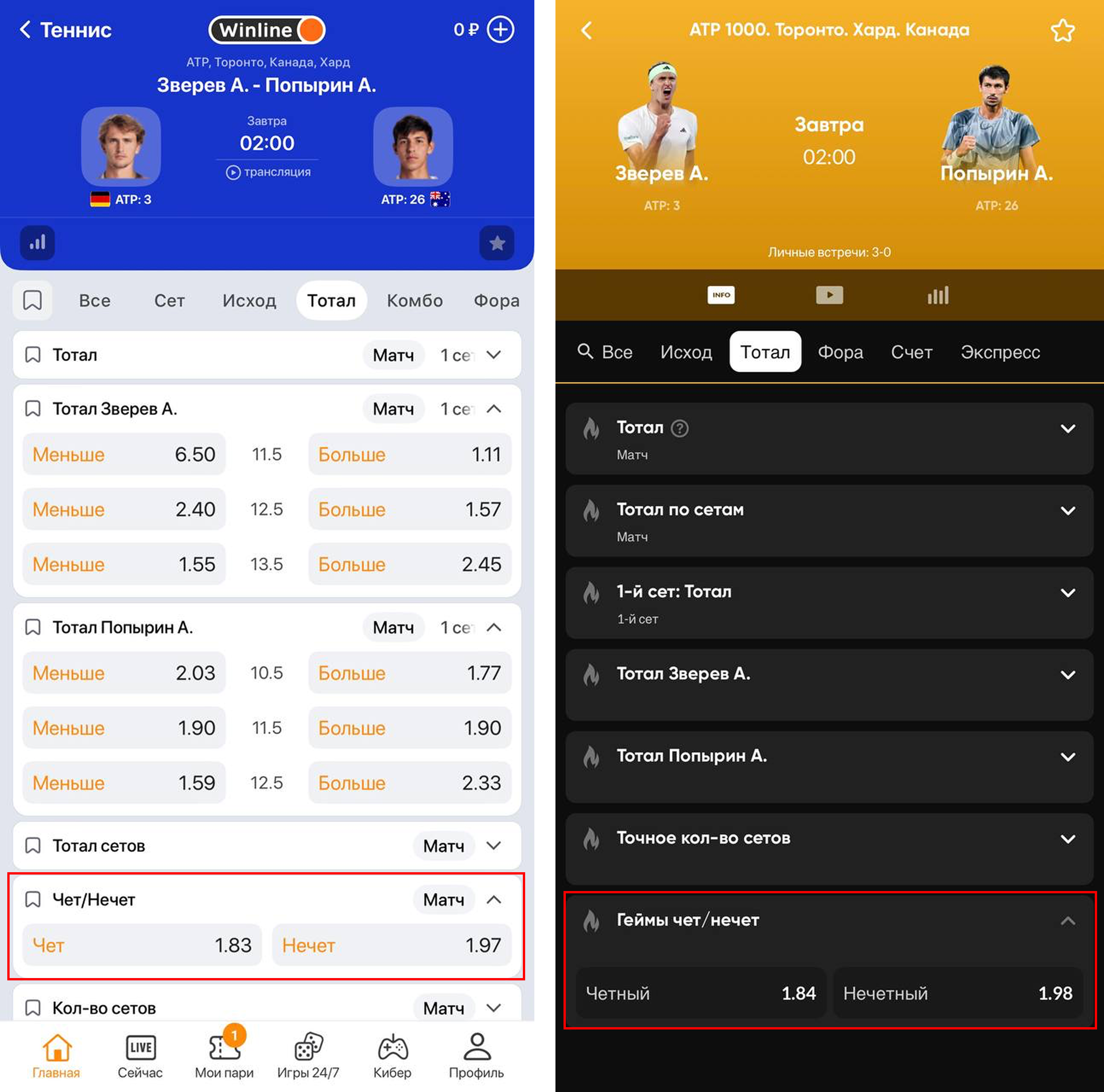 Пример №2. Второй пример – теннисный матч Александр Зверев – Алексей Попырин на турнире ATP 1000 в Торонто. В отличие от двух предыдущих игр, здесь вероятность четного и нечетного тотала тоже оценивается почти на равных – 1.97 и 1.98. Предположим, вы заключили пари на 1 000 рублей на нечетный тотал матча по геймам. Чтобы пари выиграло, теннисисты на двоих должны набрать 15, 17, 19, 21 и т.д. геймов. В этом случае выплата составит 1 970 и 1980 рублей, соответственно.
