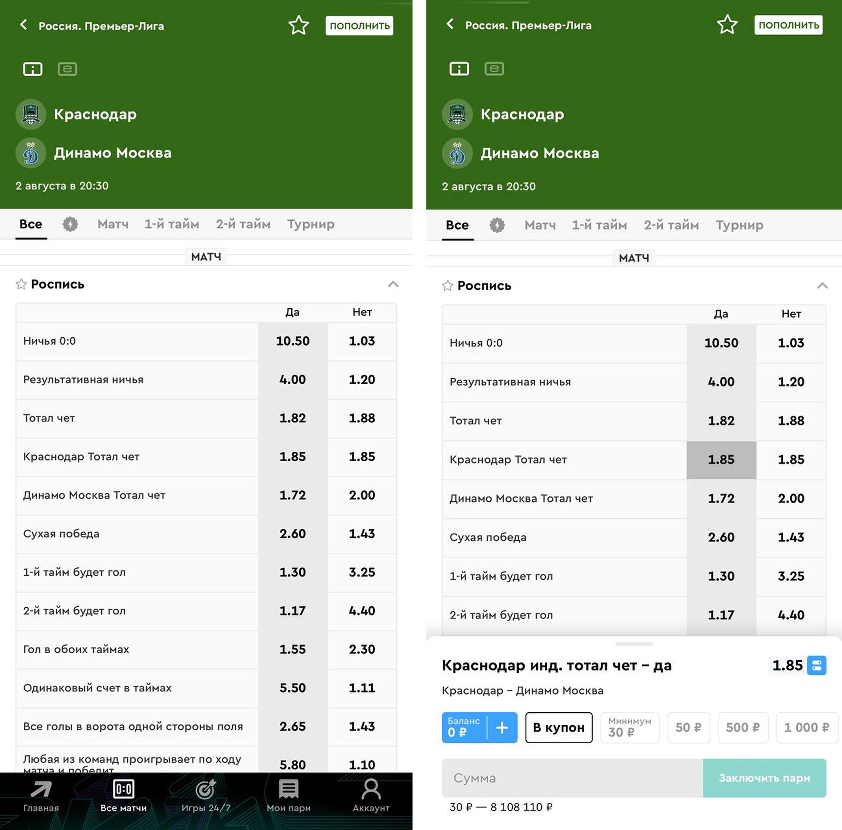 Определить средний уровень маржи без дополнительных инструментов проще всего в котировках «Чет/Нечет», такие линии, как правило, оцениваются всегда ровно, поскольку имеют шансы 50 на 50. В данной случае равные коэффициенты 1.85 означают, что комиссия БК составляет около 8%.