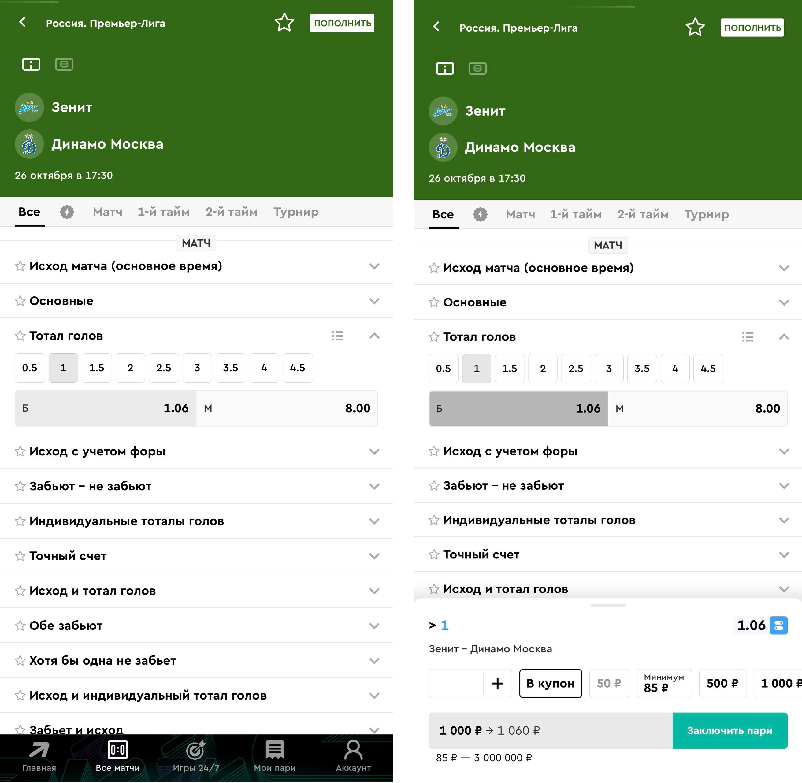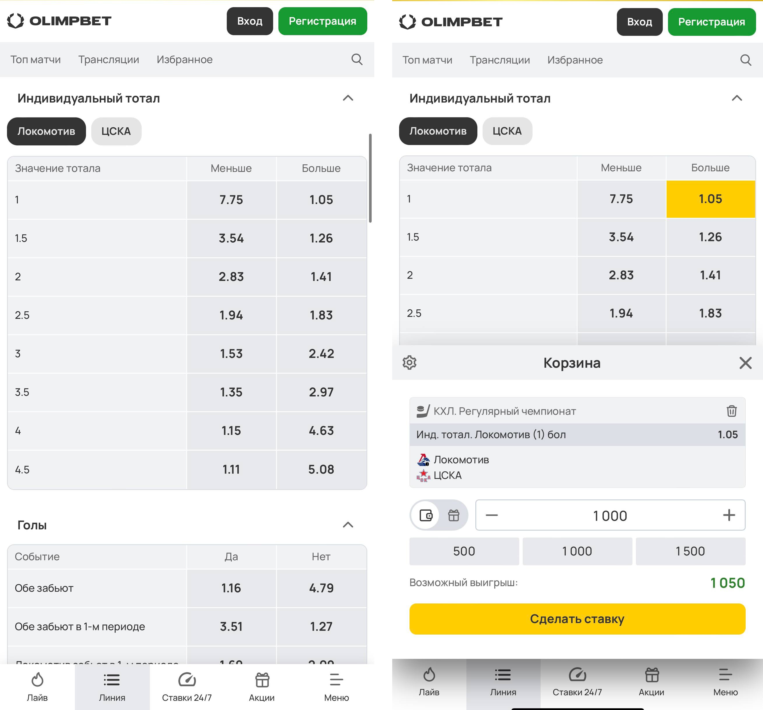 Рассмотрим маркет на примере матча «Локомотив» – ЦСКА. Ставка «больше 1» гола хозяев площадки принимается с коэффициентом 1.05. Ставим 1000 рублей.