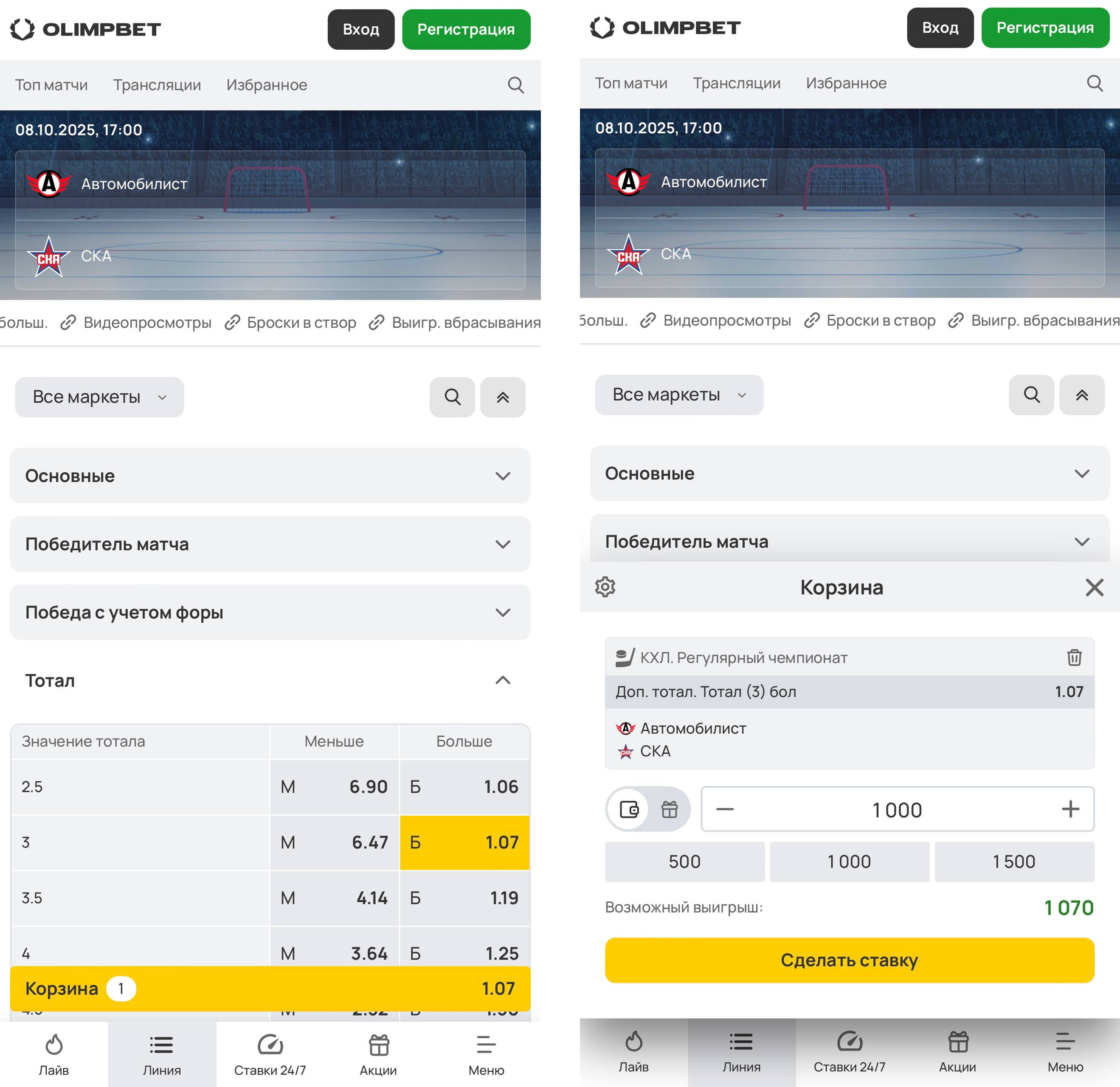 Единственный минус ставки на ТБ 3 — совсем низкие коэффициенты. Результативность хоккее на порядок выше, чем в том же футболе, а потом коэффициенты обычно не превышают 1.20. Для тех, кто хочет коэффициент покрупнее, отличным вариантом будет ставка на ТБ 3 в отдельно взятый игровой период или индивидуальный ТБ 3. Для примера все тот же матч между «Автомобилистом» и СКА. Суммарный ТБ 3 идет с коэффициентом 1.07. Суммарный выигрыш при ставке в 1000 рублей составит только лишь 1070 рублей.