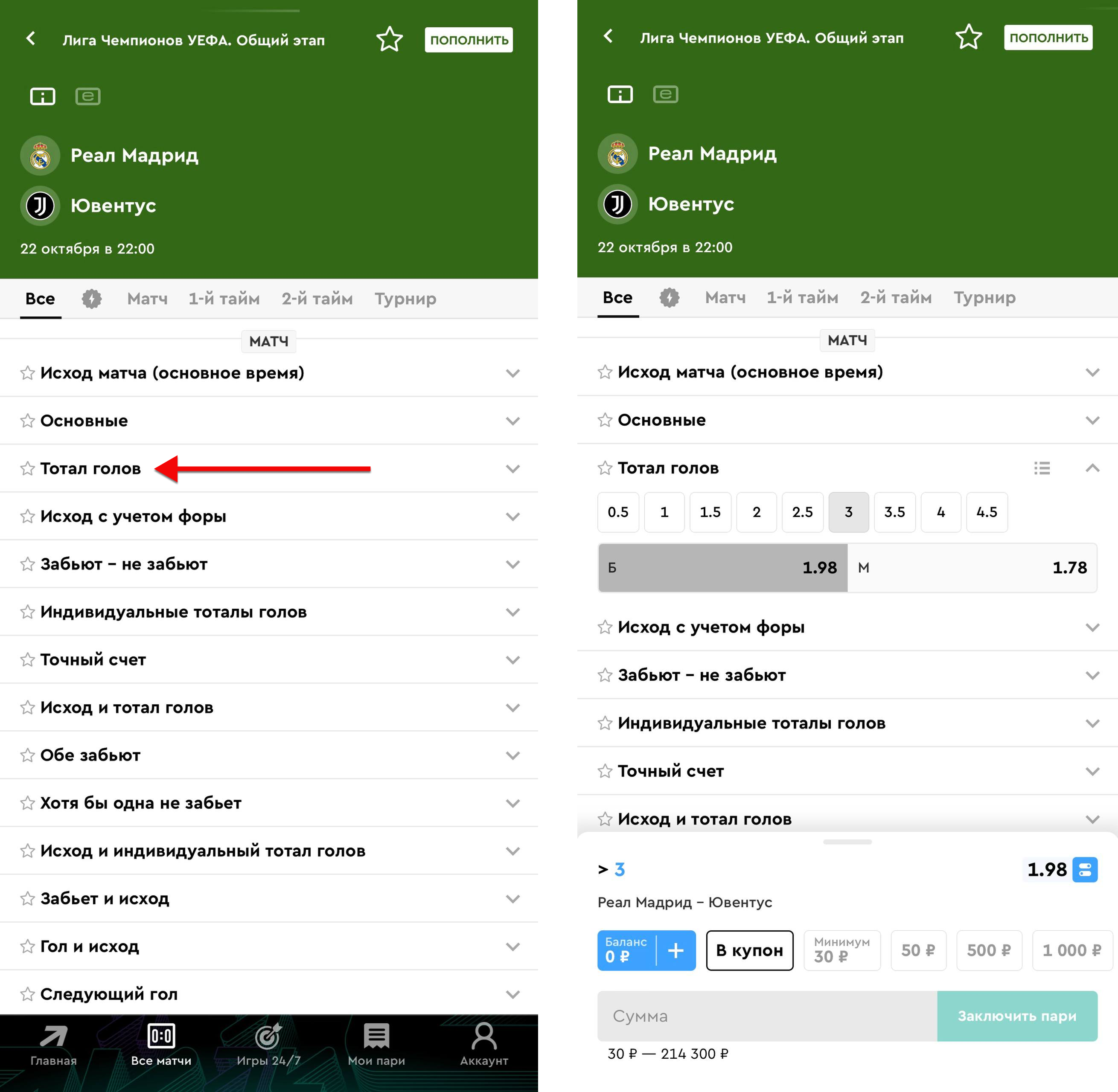 В списке маркетов найти категорию «Тоталы»/«Тотал» или пролистать ниже основных исходов и двойных шансов в разделе «Все»;