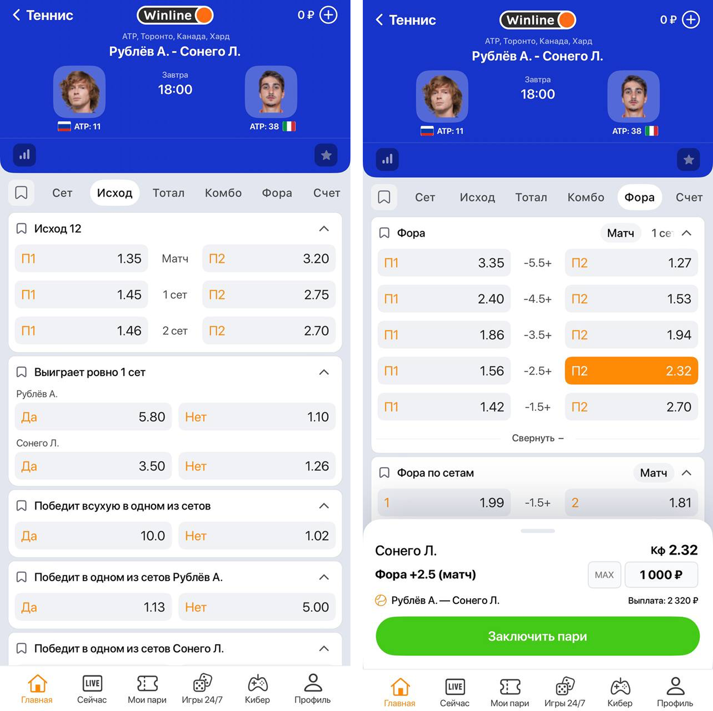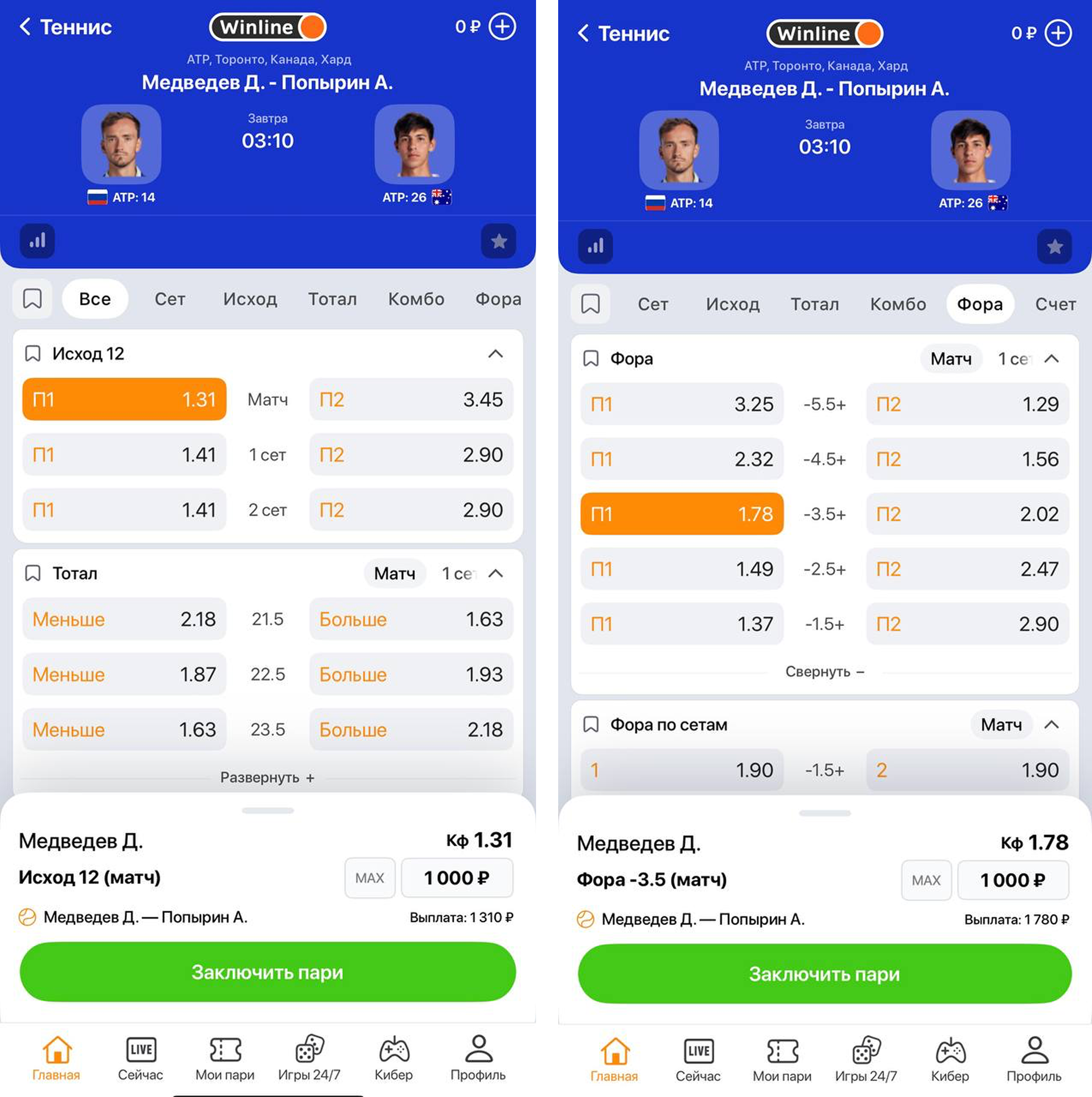 Пример – матч турнира ATP 1000 в Торонто между Даниилом Медведевым и Алексеем Попыриным. На победу Медведева предлагается скромный коэффициент 1.30. Чтобы повысить потенциальный выигрыш, можно заключить пари на фору Медведева (-3,5). Такая ставка котируется с коэффициентом 1.78.