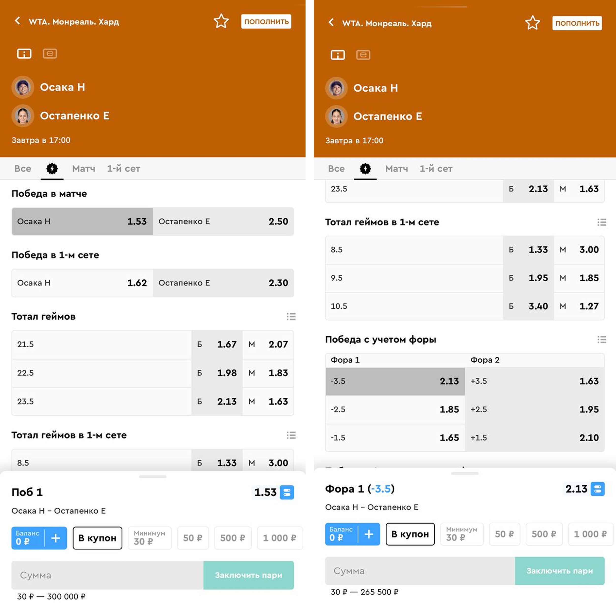 Приведем пример ставки на европейскую фору в конкретном матче между Наоми Осакой и Аленой Остапенко. На победу Осаки предлагается коэффициент 1.53,. Чтобы повысить коэффициент и потенциальный выигрыш, можно поставить на европейскую фору (-3,5) на Осаку за 2.13. Сумма – 1000 рублей. Ставка сыграет, если по итогам матча Осака наберет на 4 и более геймов больше, чем Остапенко. В этом случае вы получите в общей сумме 2 130 рублей.