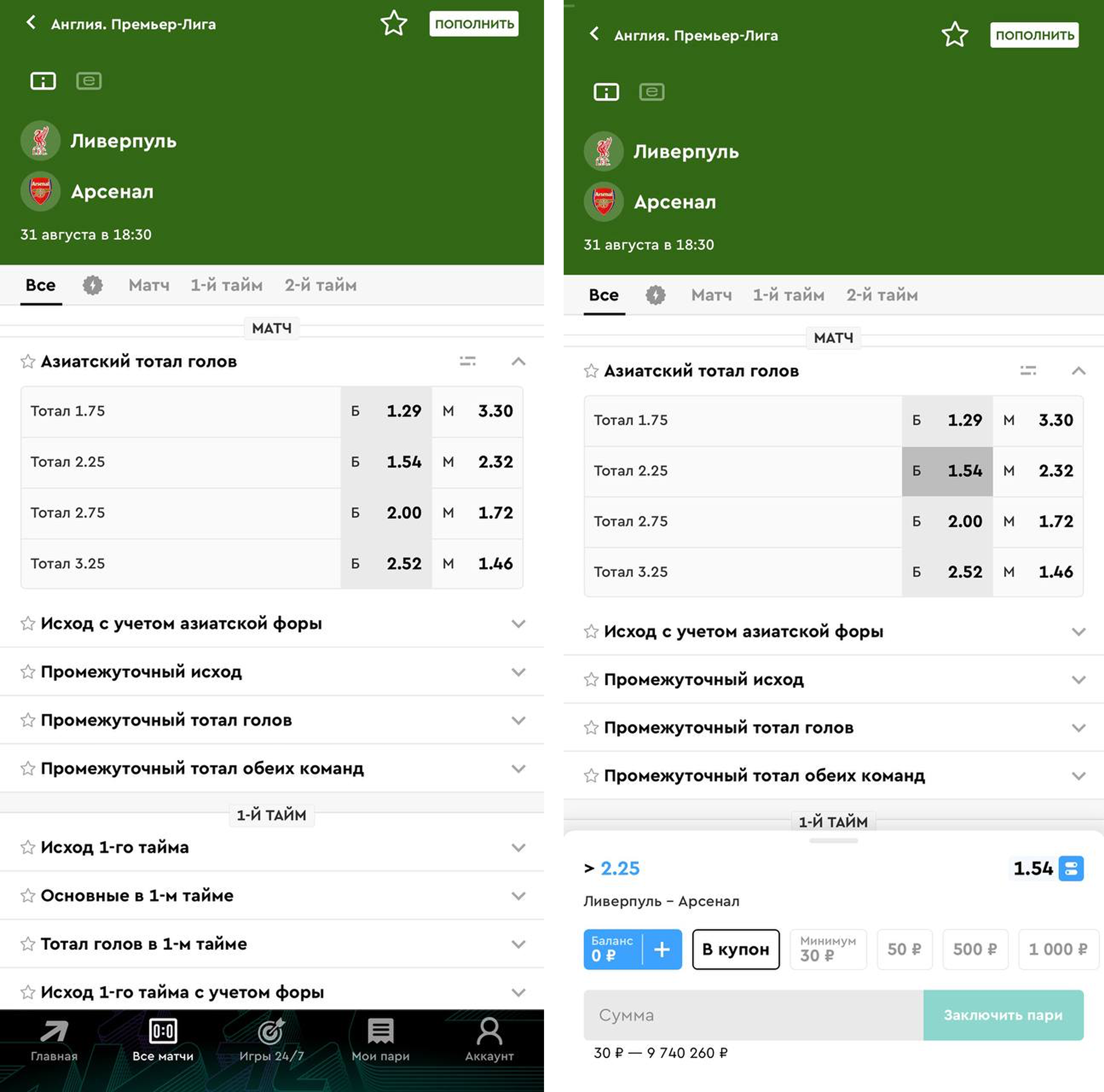Азиатский. Это тотал, значение которого выражено дробным числом с шагом 0,25. Примеры азиатского тотала: ТБ/ТМ 1,25, ТБ/ТМ 1,75, ТБ/ТМ 2,25 и так далее. Сумма вашей ставки на азиатский тотал делится поровну между двумя соседними европейскими.