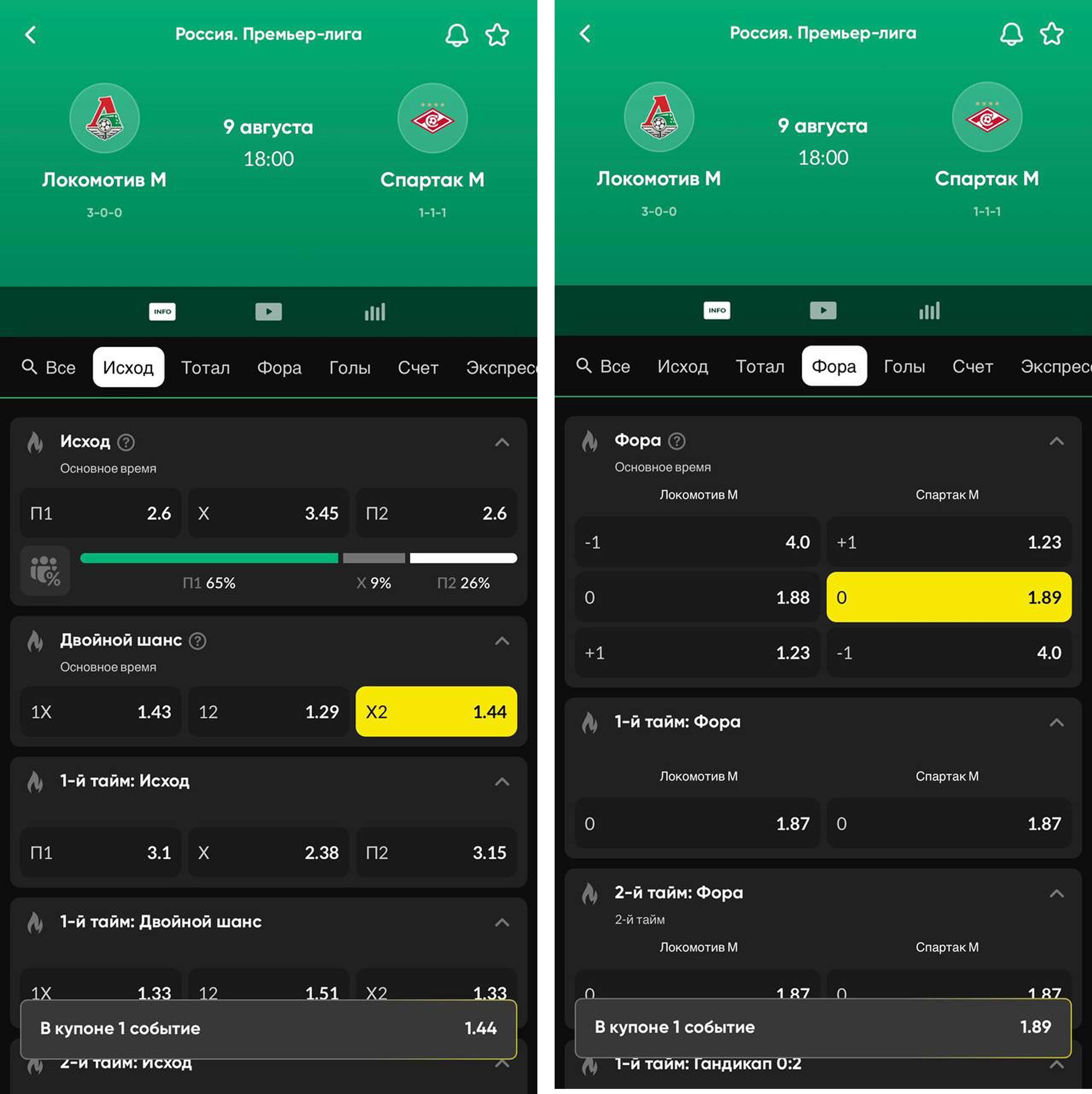 Иными словами, если ставить на х2 с меньшим коэффициентом, то при ничьей пари все равно выиграет. Но если ничья произойдет при ставке с нулевой форой, пусть и с более высоким кэфом, игрок не получит прибыли – пари будет рассчитано возвратом. Для наглядности приведем пример. Матч «Локомотив» – «Спартак». Коэффициент на х2 составляет 1.44. Выглядит средне и кому-то явно будет хотеться большего. Находим в росписи ставку фора 2 (0) и видим, что она идет уже за 1.89.